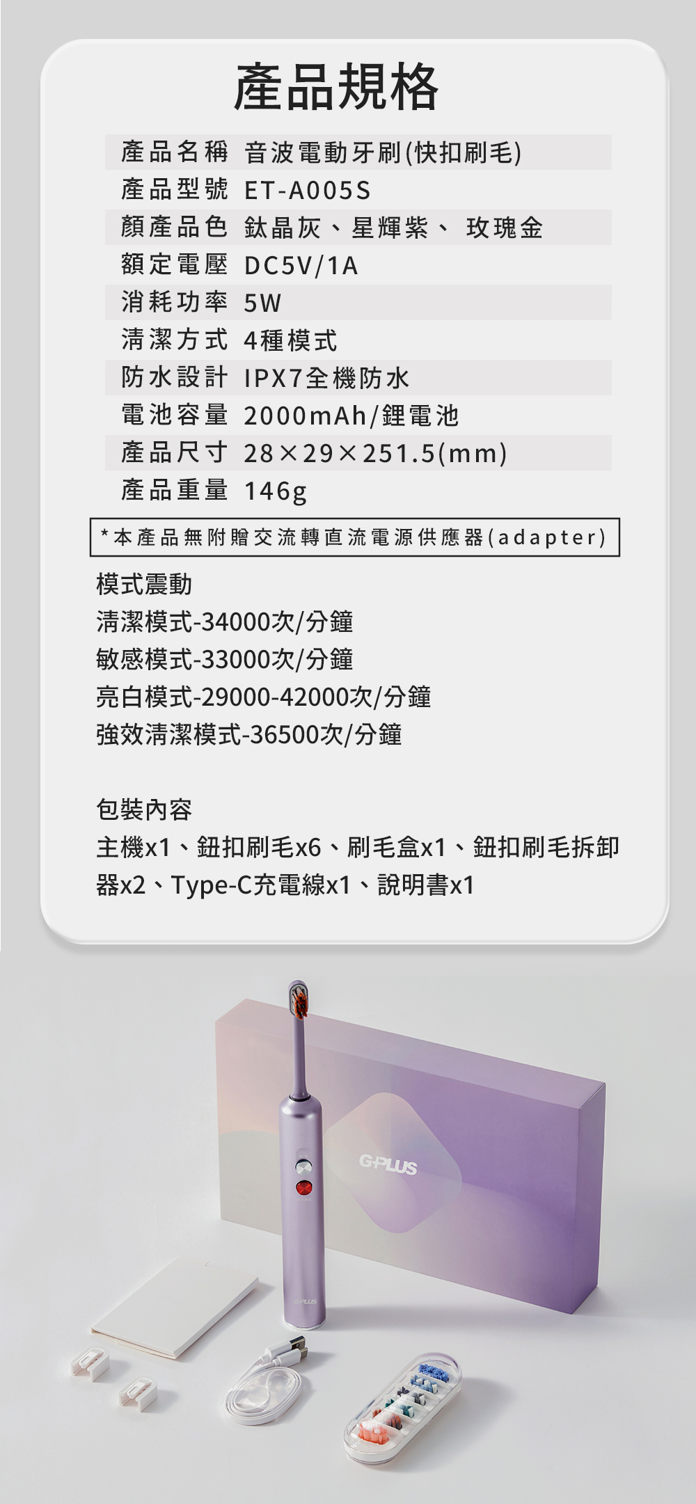 包裝內容:主機*1/鈕扣刷毛*6/刷毛盒*1/鈕扣刷毛拆卸器*2/Type-c充電線*1/說明書*1