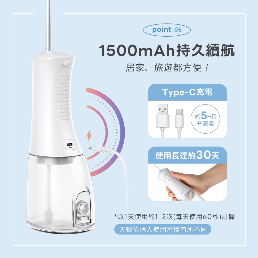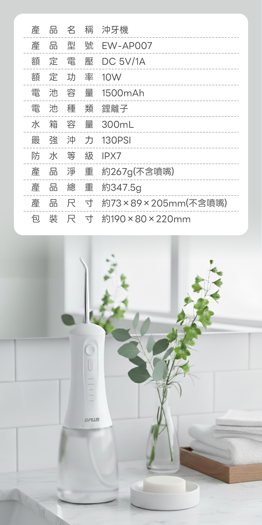 產品內容:主機*1/USB充電線*1/標準噴嘴*2/矯正噴嘴(清洗牙套)*1/齒間噴嘴*1/說明書*1