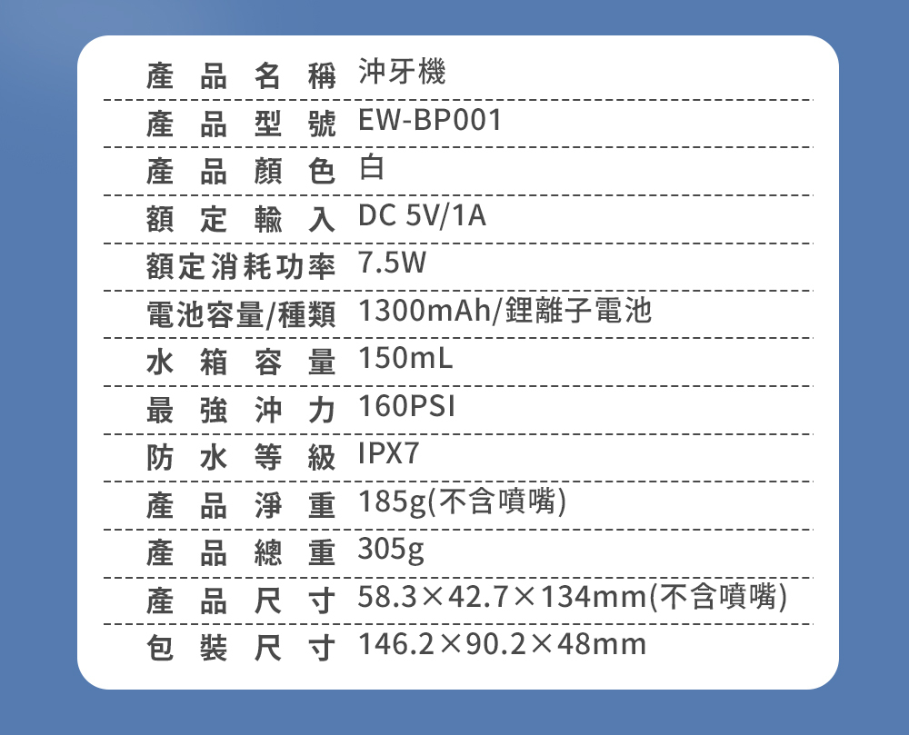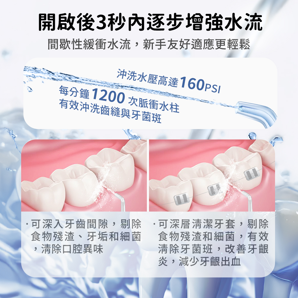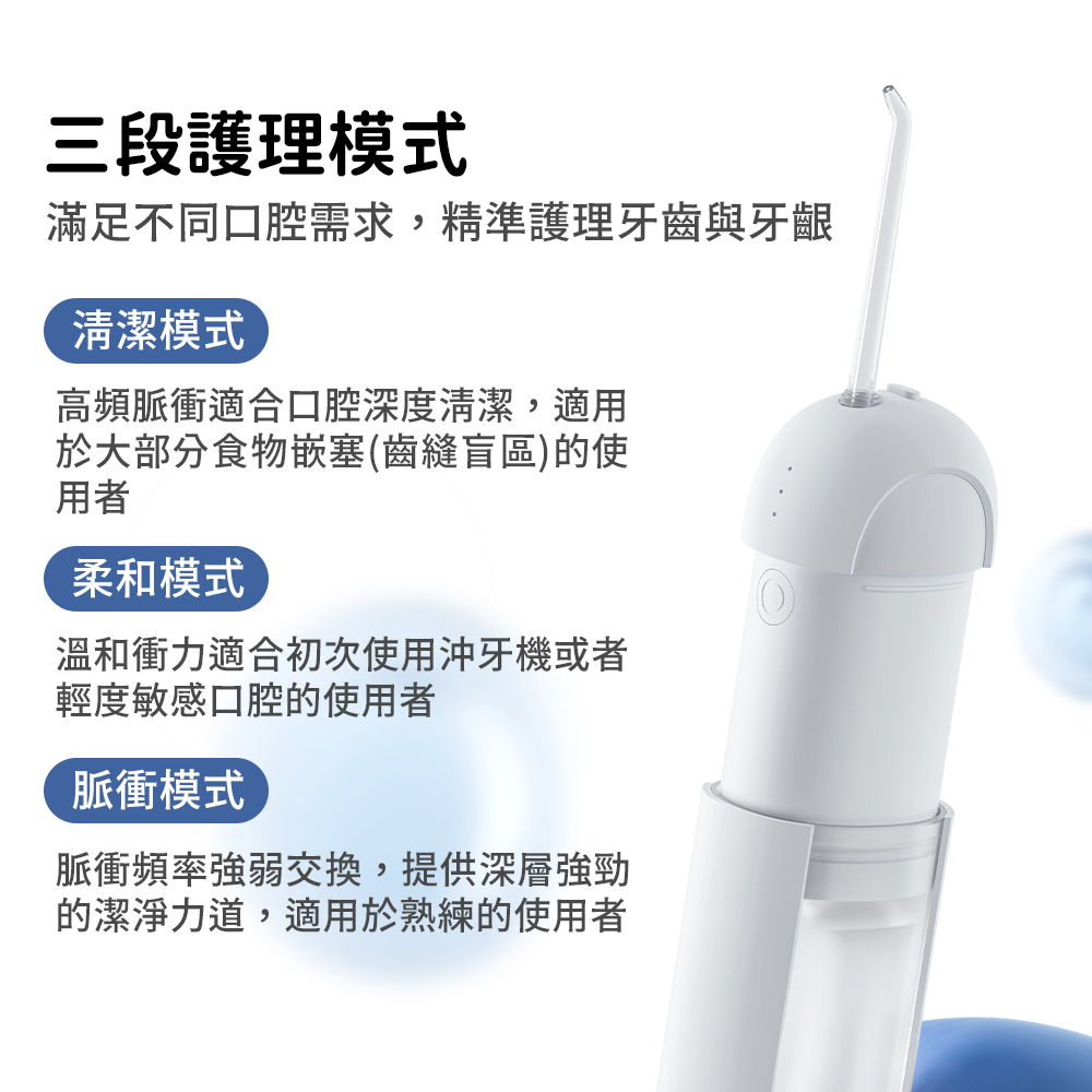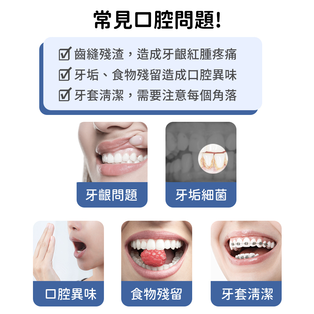 產品內容:主機*1/USB電源線*1/標準噴嘴*2/矯正噴嘴(清洗牙套)*1/齒間噴嘴*1/說明書*1