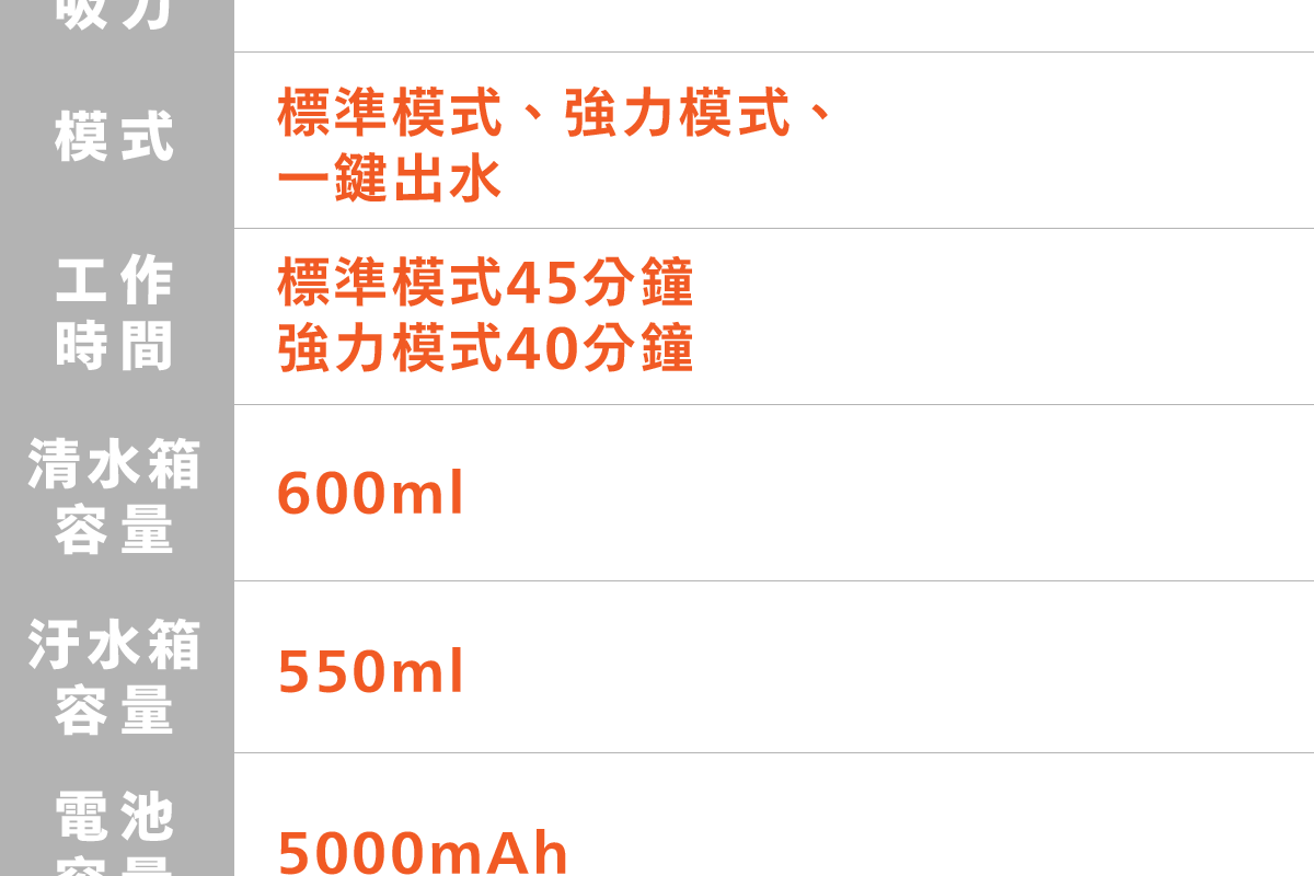 產品內容:機身主機(含清水箱/汙水箱)*1/地毯刷(雙排植毛刷)*1/地板刷(絨毛刷)*1/管線清潔刷*1/濾網清潔刷*1/HEPA濾網(H13)*1/充電座(含充電器)*1/說明書*1
