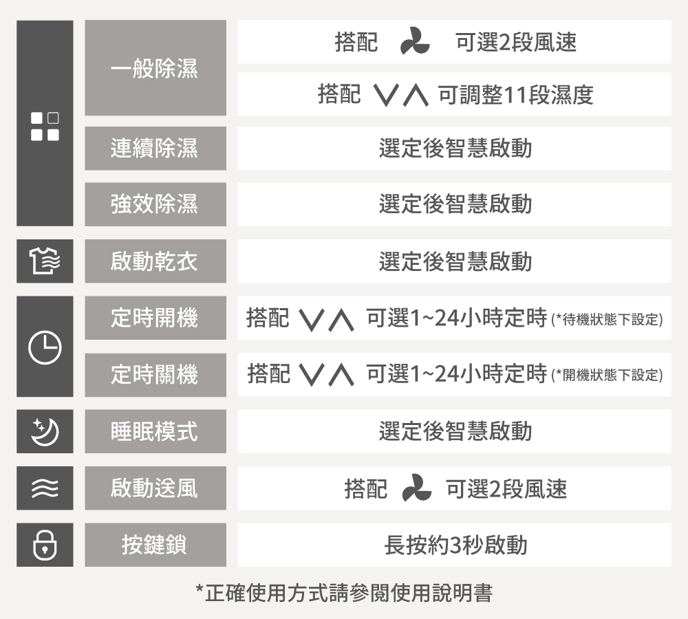 .定時除濕 | 乾衣模式 | 睡眠模式